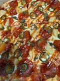 Pepperoni, sausage, mushroom, green pepper, red onion, and black olives.