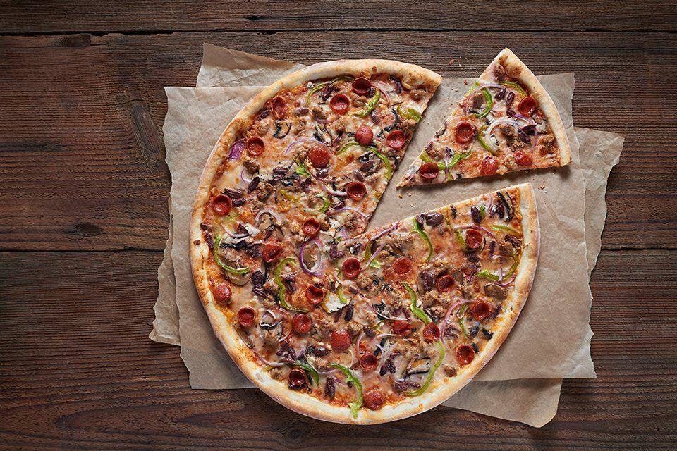 Flippin' pizza sauce, 100% whole milk mozzarella, pepperoni, sausage, green bell pepper, red onion, black olives, sliced mushrooms and fresh garlic.