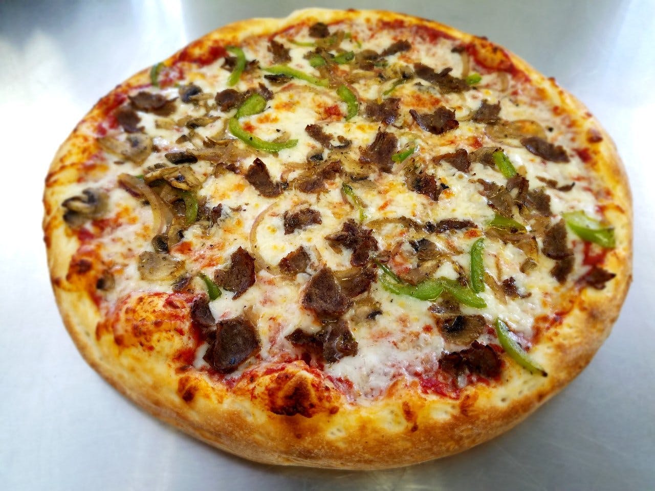 Philly steak, bell peppers, red onions, and mushrooms.