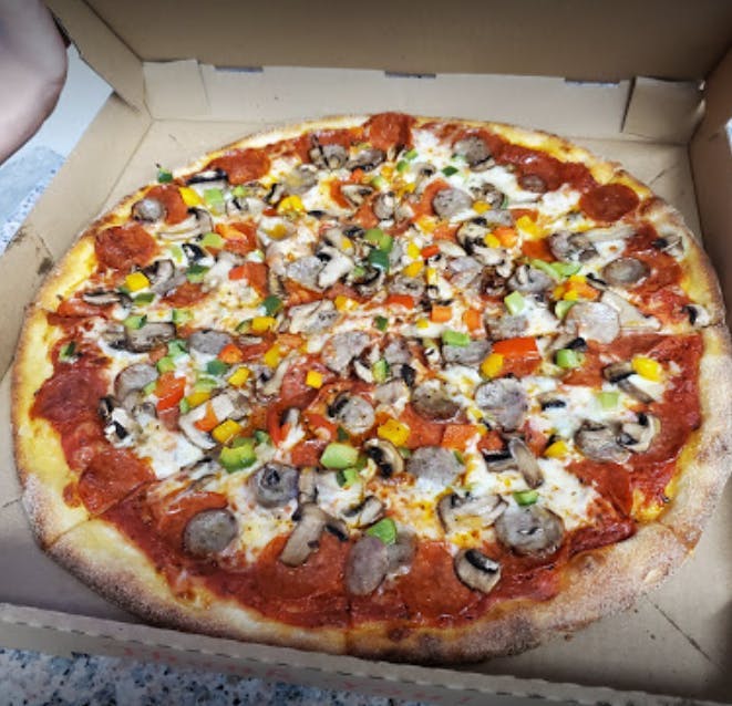 Pepperoni, sausage, mushrooms, bell peppers, onions, and olives.