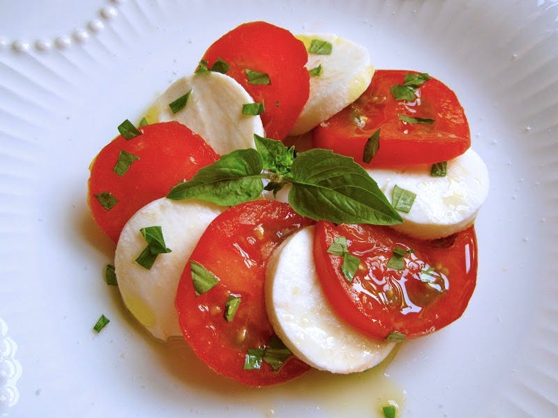 Slices of fresh mozzarella cheese and Roma tomatoes marinated in cold-pressed olive oil and fresh Italian basil.