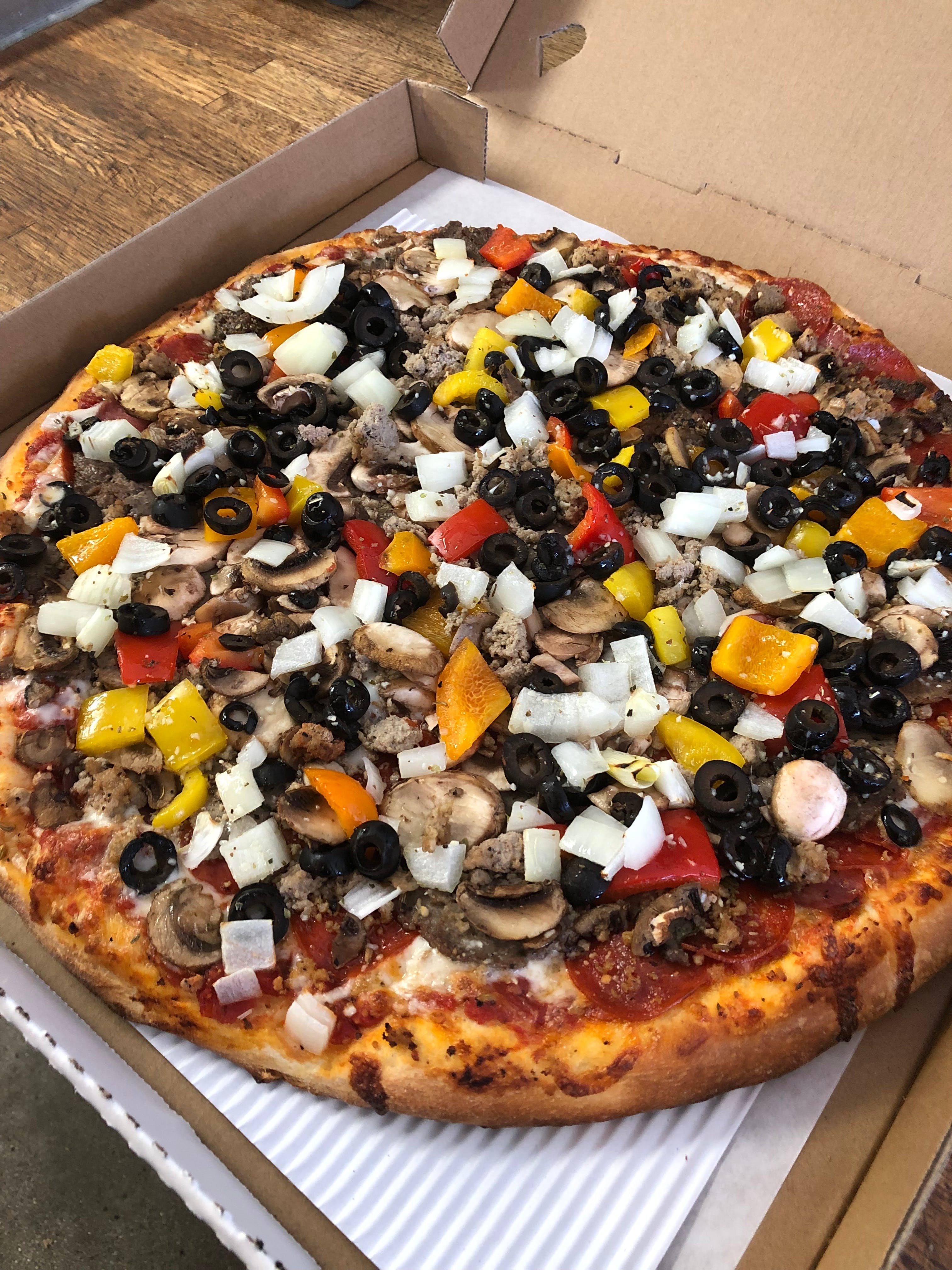 Salami, pepperoni, handmade crumbled sausage, handmade meatball, fresh mushroom, bell pepper, black olives & white onions.