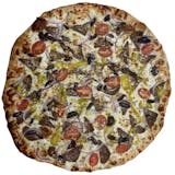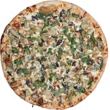 Ingredients: Olive Oil Base, Chicken Breast, Artichoke Hearts, Sun-Dried Tomato, Mushroom, Kalamata Olives, Feta, Parmesan, Fresh Spinach, Basil