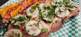 Ricotta cream Sauce, aged mozzarella, fresh mozzarella, and Dill pickles.