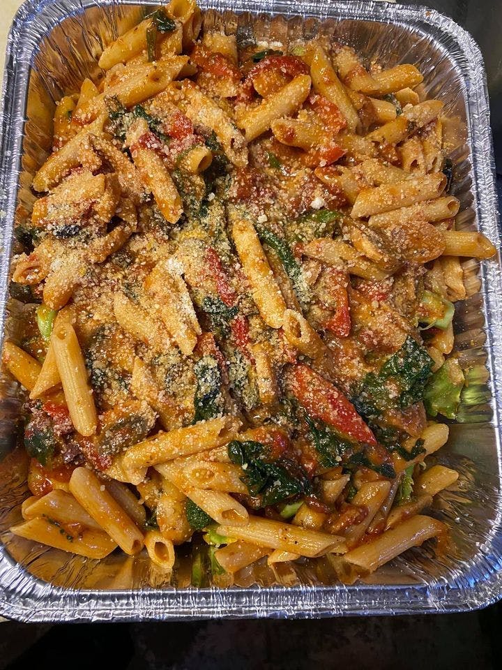 With sweet and hot Italian sausage, peppers, mushrooms, and onions in white wine with a touch of tomato sauce.