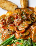 Lightly sautéed chicken breast with sausage, sweet and hot peppers, and fresh herbs.
