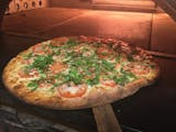 White pizza. Fresh tomatoes, olive oil, fresh garlic, basil & mozzarella cheese.