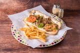 Onions, lettuce, tomato, feta cheese, cucumbers, sauce on the side. Served on pita bread.