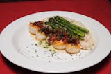 Fresh native scallops served alongside sun dried tomato risotto, asparagus, and dappled with chopped bacon.