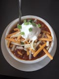 Sliced baked potato, crispy bacon, cheddar cheese, and scallions, served with a side of sour cream.