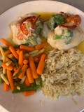 Chicken, chunks of lobster, and broccoli sauteed in a lemon butter sauce topped with mozzarella cheese.