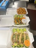 3 homemade corn tortillas with pork. Served with fresh onions, cilantro, lime homemade Mexican salsa, radish, and cucumbers.