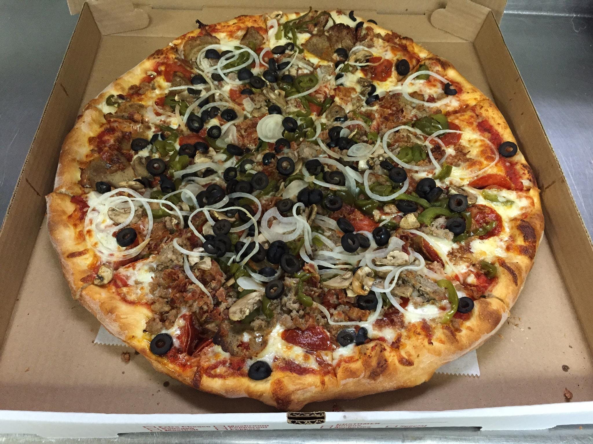 White or red sauce, mushrooms, hot peppers, onions, olives & mozzarella.