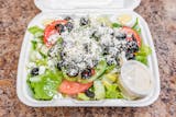 Tomatoes, cucumbers, onions, olives, and feta cheese in an olive oil dressing.