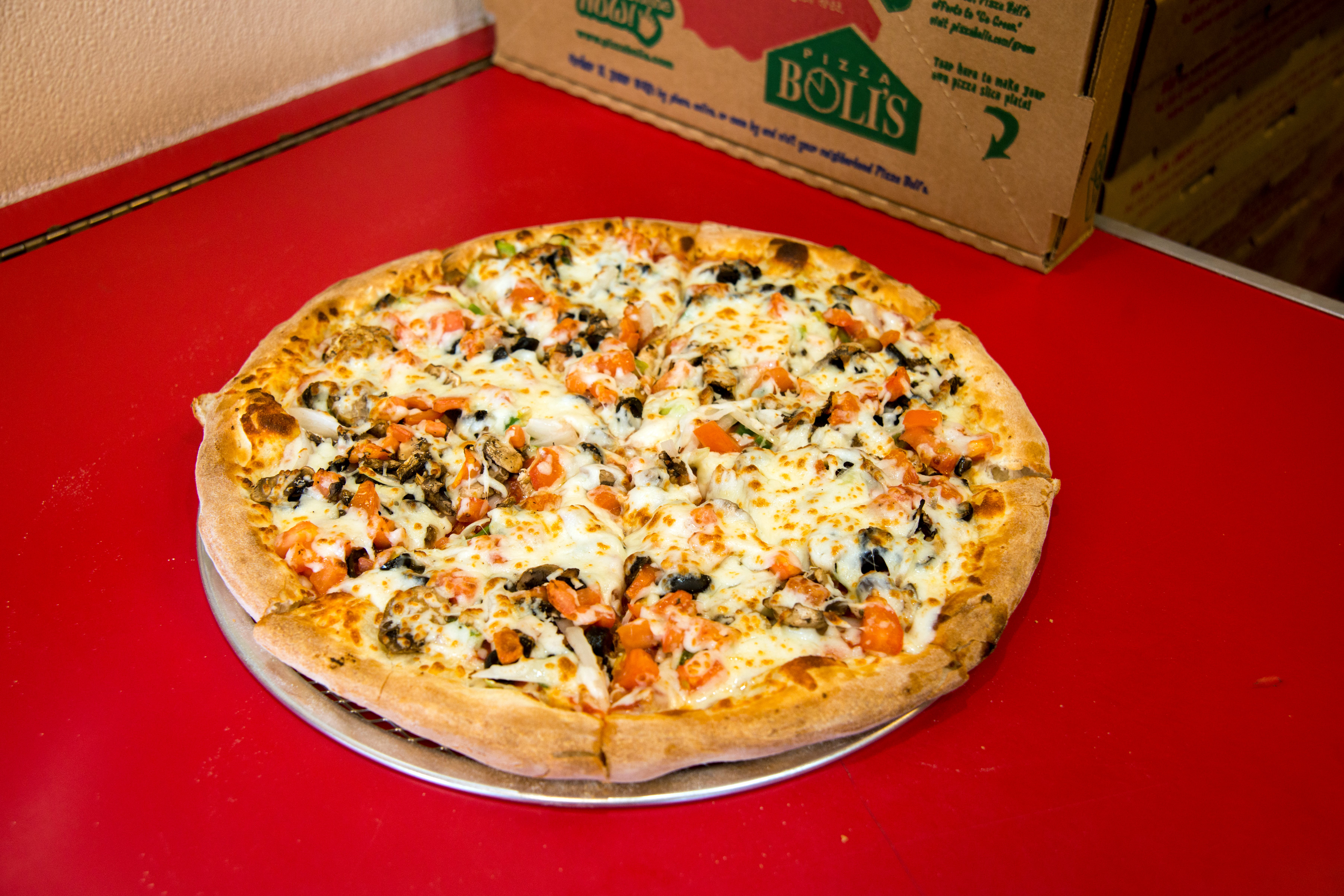 Our Secret Recipe Pizza Sauce topped with Fresh Mushrooms, Fresh Green Peppers, Fresh Tomatoes, Fresh Onions, Black Olives and topped with an extra amount of Our Special Blend of 100% Fresh Natural Cheeses