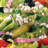 Mixed lettuce, green pepper, tomato wedges, red onion, cucumbers, Kalamata olives, banana peppers.