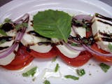 Fresh mozzarella over sliced beefsteak tomatoes, red onions & basil with balsamic glaze