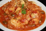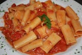 Fresh boneless chicken with mushrooms, peppers and onions in a light wine marinara sauce over penne