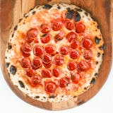 Tomato sauce, shredded mozzarella, and parmesan cooked in our wood fired oven.
