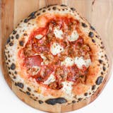 Spicy Sausage, burrata, mozzarella, roasted red pepper, calabrian chili & oregano cooked in our wood fired oven.