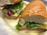 Ham, salami, fresh red onion, banana pepper, olive, fresh romaine lettuce, fresh tomato, oregano & oil & vinegar, served with a small bag of chips.