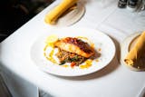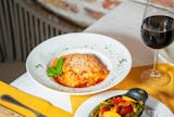 Pork and beef meatball, soft polenta, San Marzano, topped with ricotta.