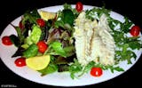 Grilled fresh Branzino cut into butterfly-shape and topped with grated bread, garlic, parsley, olio extravergine di oliva, salt and black pepper.