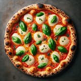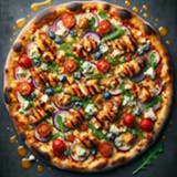 Mozzarella, red onions, roasted garlic, broccoli, tomatoes, pesto & balsamic glaze.