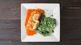 Baked filet of salmon, sauteed in a light garlic cherry tomato sauce, served with sauteed spinach.