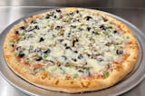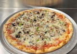 Pepperoni, sausage, mushrooms, onions, green peppers, black olives.