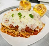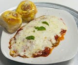 Eggplant, with marinara sauce and mozzarella cheese, served with 2 garlic knots.