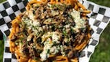 With fries. Pizza sauce, pepperoni, salami, provolone cheese, onions, and marinara sauce.