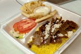 Seasoned gyro meat on pita topped with tzatziki sauce, tomatoes, and onions.