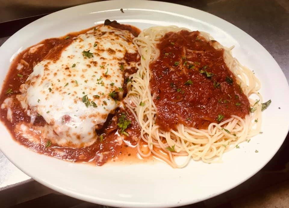 Fresh veal topped with homemade marinara sauce and mozzarella cheese, served with a side of spaghetti.