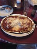 Veal and eggplant layered and baked in tomato sauce and mozzarella cheese.