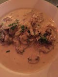 Chicken breast dipped in egg, mushrooms in lemon and butter white wine sauce.