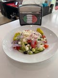 Pesto sauce, feta cheese, spinach, black olives, mozzarella.