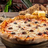 Pizza sauce, mozzarella, chicken, corn, bacon, heart of palms, mushrooms, green olives, Catupiry®, and oregano.