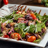 Spinach, onions, tomatoes, black olives, feta cheese, and balsamic vinaigrette dressing.