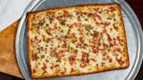 Square semi-thick crust, crushed plum tomatoes marinated in herbs, fresh basil, extra virgin olive oil and pecorino romano cheese. This pizza is made in one size only with 8 slices.