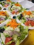 Fresh chopped romaine hearts, Roma tomatoes, red onion, black olives, cucumbers, & carrots.