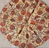 Pepperoni, sausage, onions, green peppers, black olives, mushrooms and banana peppers.