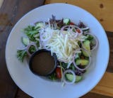 Romaine lettuce and mixed greens, cherry tomatoes, red onions, cucumber & mozzarella cheese.