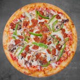 Pizza Sauce, mozzarella cheese, pepperoni, sausage, green peppers, mushrooms, onions.
