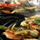 Chicken with onions & jalapenos, served with tortillas, rice & beans.