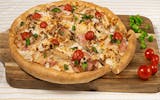 Sarpino's traditional pan pizza baked to perfection and topped with juicy Canadian Bacon, freshly sliced pepperoni and Italian sausage, sauteed onions, ripe tomatoes, fresh basil and our signature gourmet cheese blend.