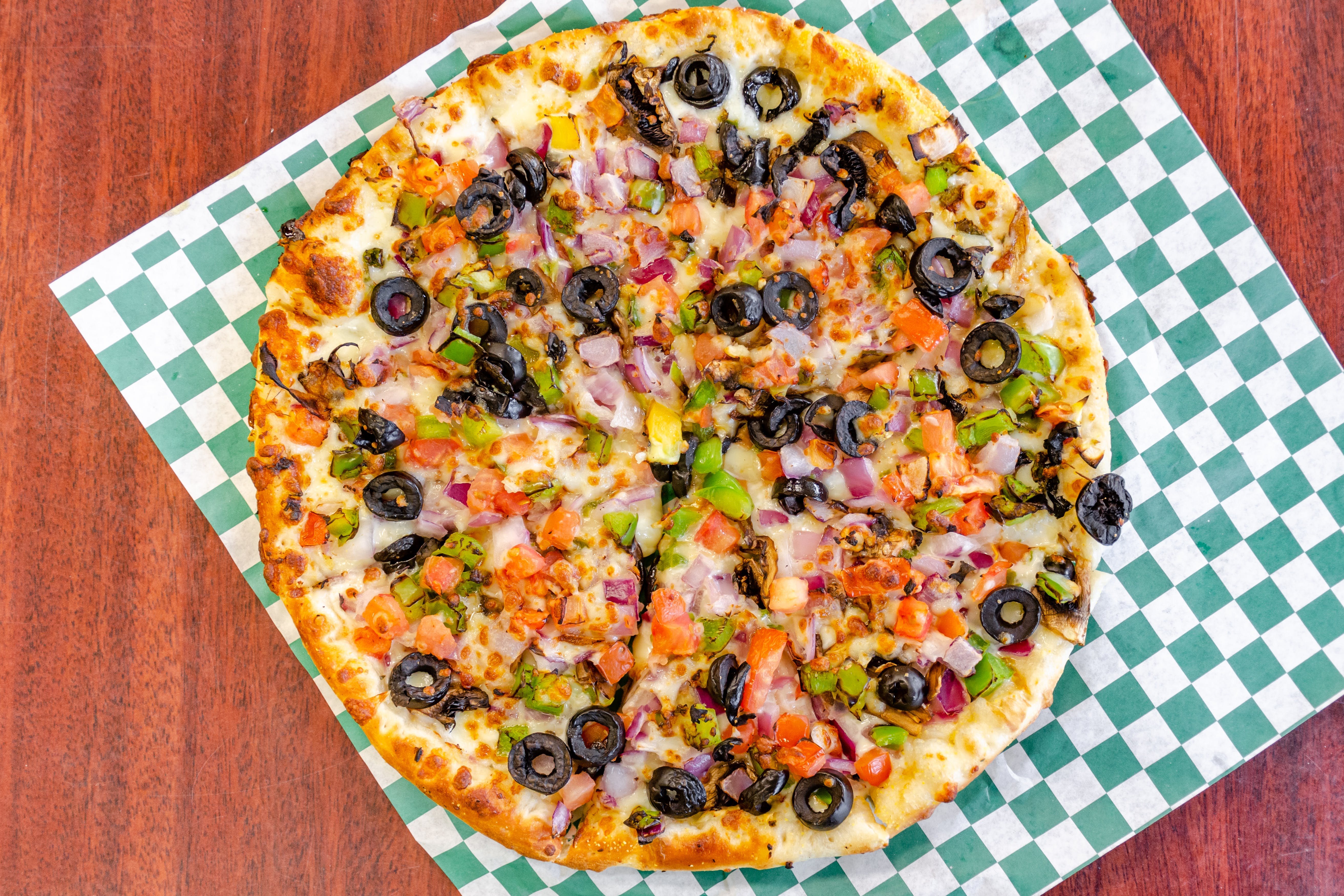 Red sauce, cheese, mushrooms, red onions, black olives, green pepper, artichoke hearts, fresh tomatoes.