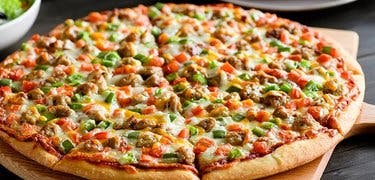 Our original crust topped with traditional red sauce, whole-milk mozzarella, premium pepperoni, Italian sausage, ground beef, sliced mushrooms, mixed onions, green peppers, black olives, and cheddar.