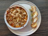 Delicious mac and cheese base topped with parmesan and mozzarella!