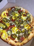 we mop this pizza with garlic butter, pile on the cheese, crushed red pepper, two types of meat, banana & jalapeno peppers...spicy!